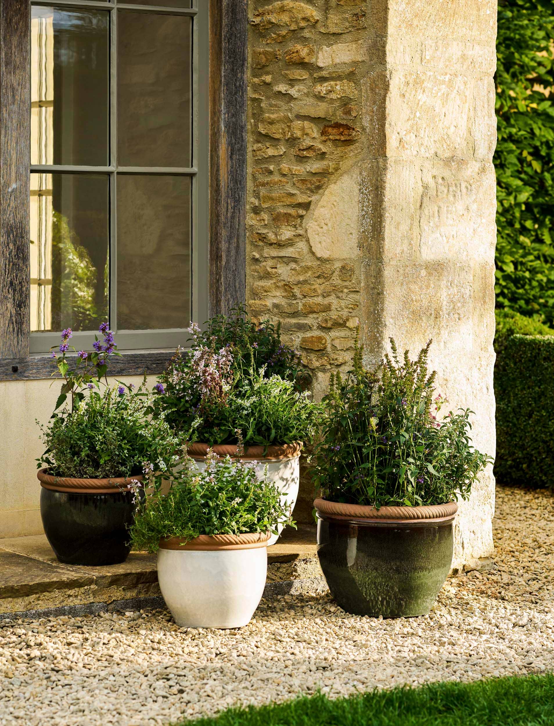 Think self-binding gravel paths, raised vegetable beds, pleached trees, weathered timber outdoor dining sets, and oversized terracotta planters – a cooking and dining space designed to feel productive, natural and beautifully established.