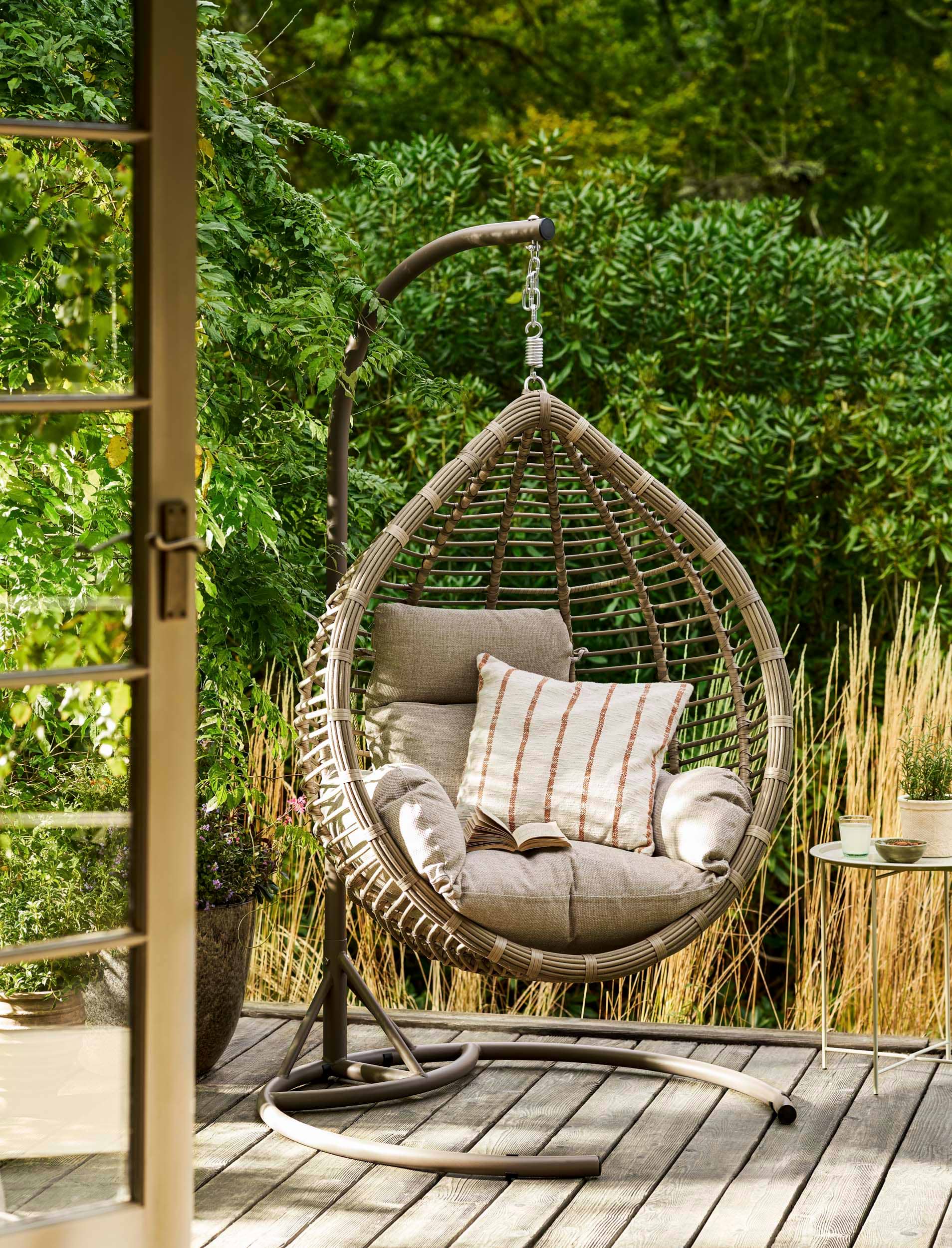 Inspired by the creative garden aesthetic of Stacey Solomon, the Frilford egg chair adds a playful focal point to outdoor spaces. The hanging rattan design creates a cosy nook for reading, relaxing or simply enjoying the garden from a different perspective.