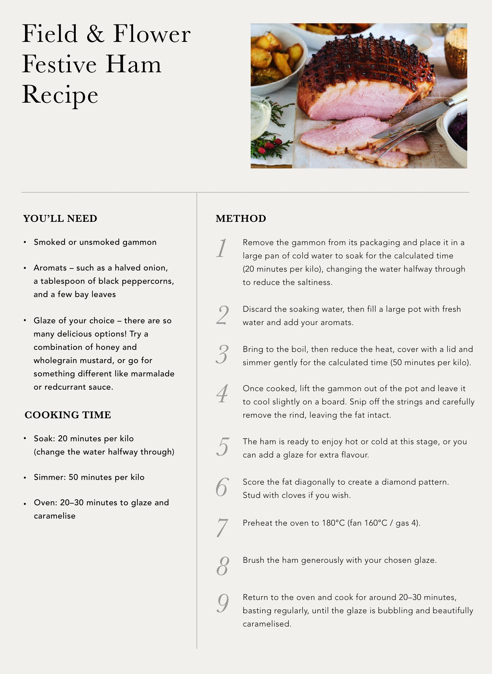 This centrepiece is worth gathering around. Field & Flower’s classic festive ham brings comforting aromas to the kitchen and a rich, savoury sweetness to the table. Whether served warm with roast potatoes or cold with chutney and pickles, it’s a true seasonal favourite that never fails to impress.