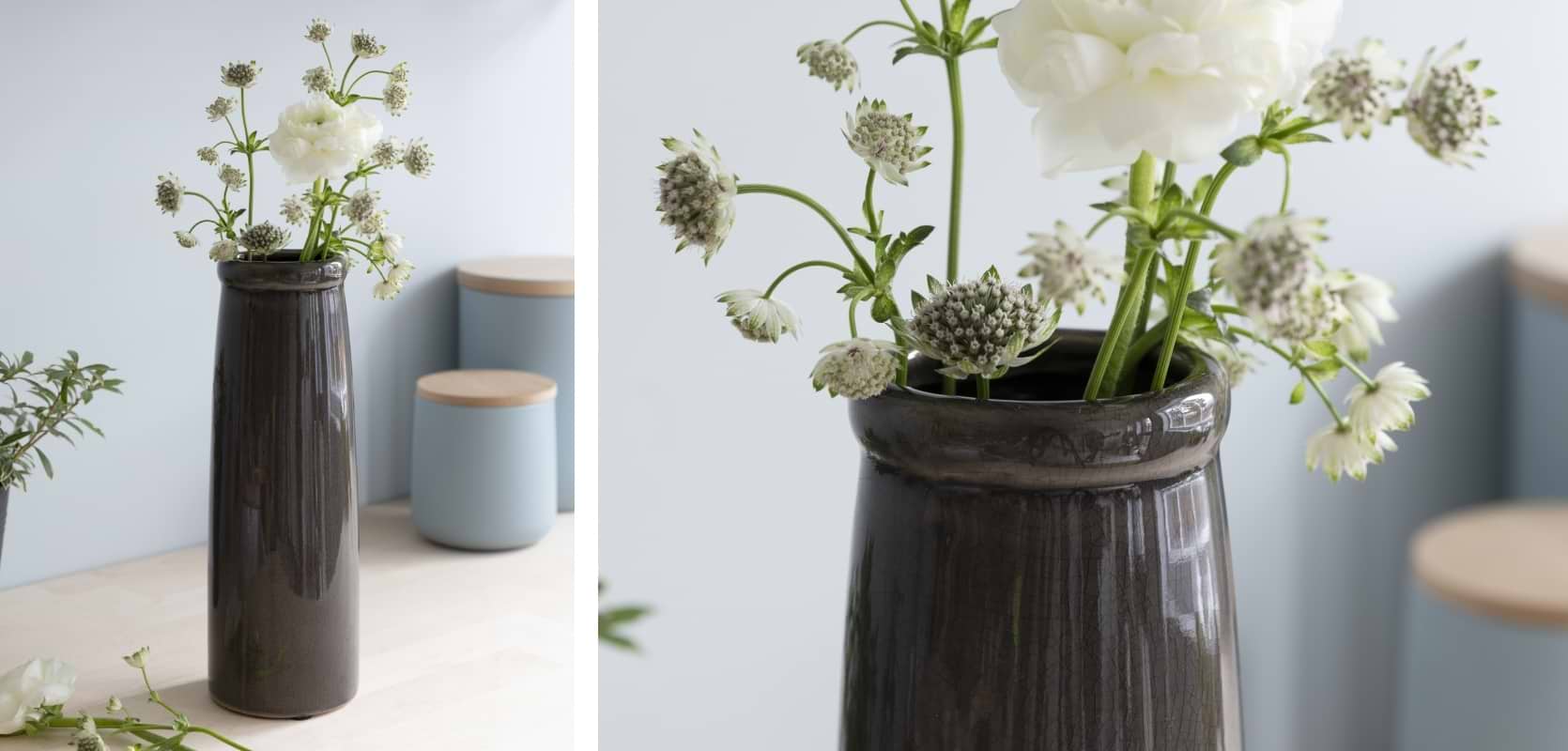 Bring nature indoors with the understated elegance of the Ravello Bottle Vase. Its chunky form and gently rolled neck give it a timeless silhouette—perfect for fresh blooms, wildflower posies, or dried arrangements that last all season. Choose from a soft crackle white or this new deep charcoal glaze to complement your mantel, console table, or windowsill. Entertaining? Mix and match with other pieces of the Ravello collection to create a dining table look that feels beautifully considered.
